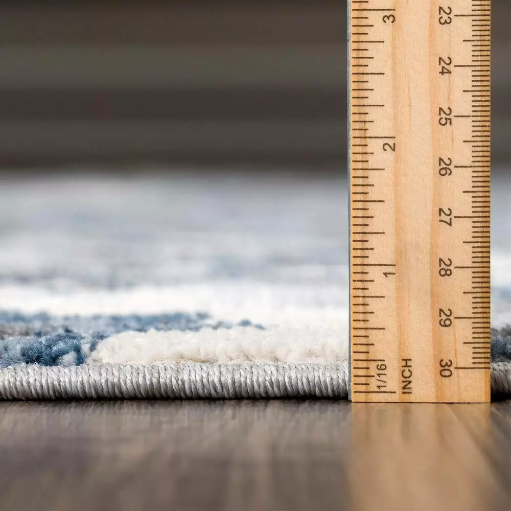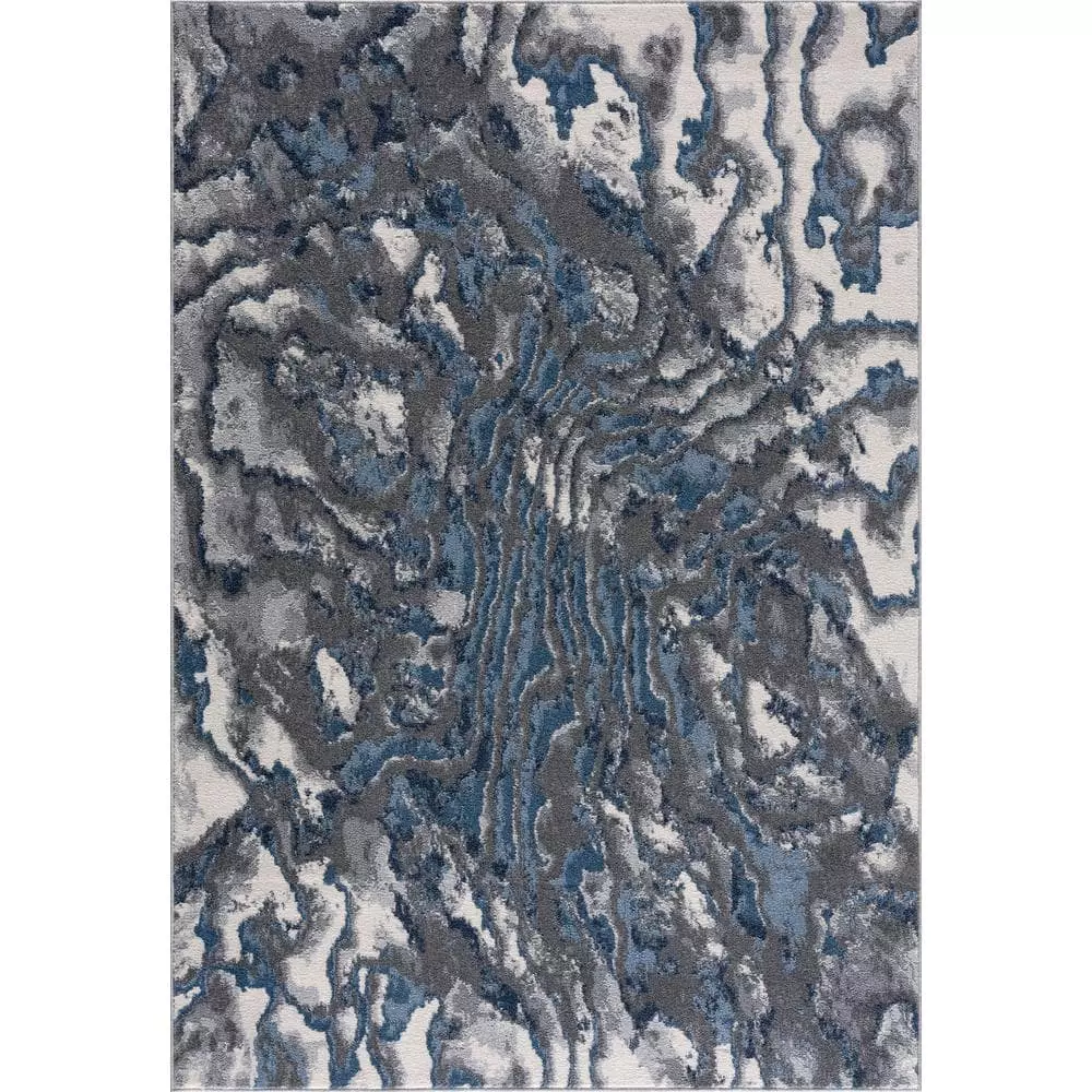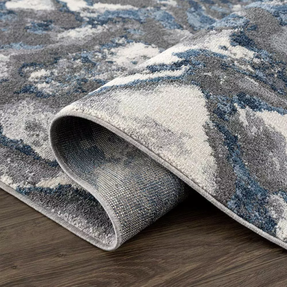 A unique grey area rug with intricate designs in blue to create a pattern with dimension. Elevate any space with this area rug by adding a subtle wow effect. A contemporary abstract design inspired by the landscapes of nature.