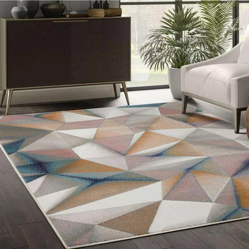 Add geometrical interest to your room decor with this statement rug. Featuring a modern abstract 3D design paired with fresh colors of beige, corals and blues create the perfect blend of up to date fashion trends that will also stand the test of time. This unique rug shows off your sense of style, allowing it to be a focal point in your decor while bringing together an entire room. Perfect for the home or office, if you are looking for a hardwearing rug that looks fabulous too then this rug is perfect. Made from polypropylene yarn and power-loomed it is stain resistant, easy to clean and doesn’t fray either.