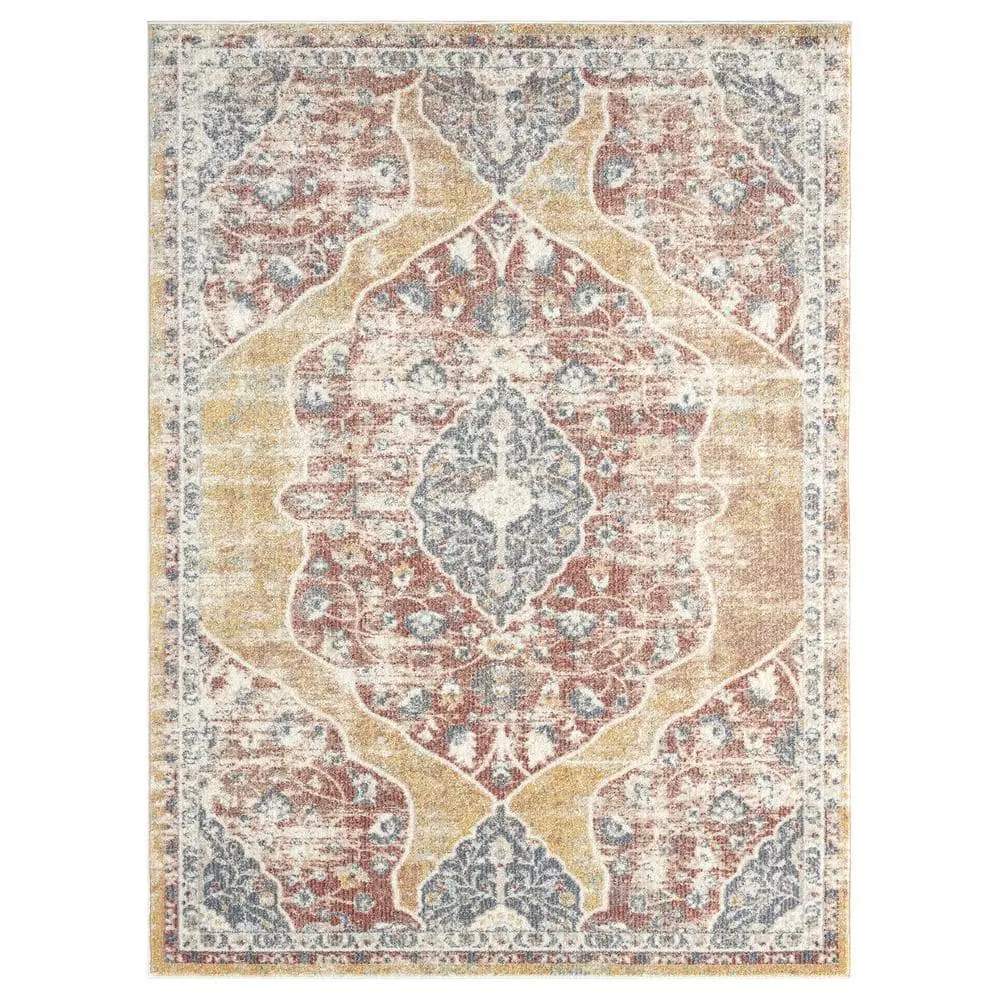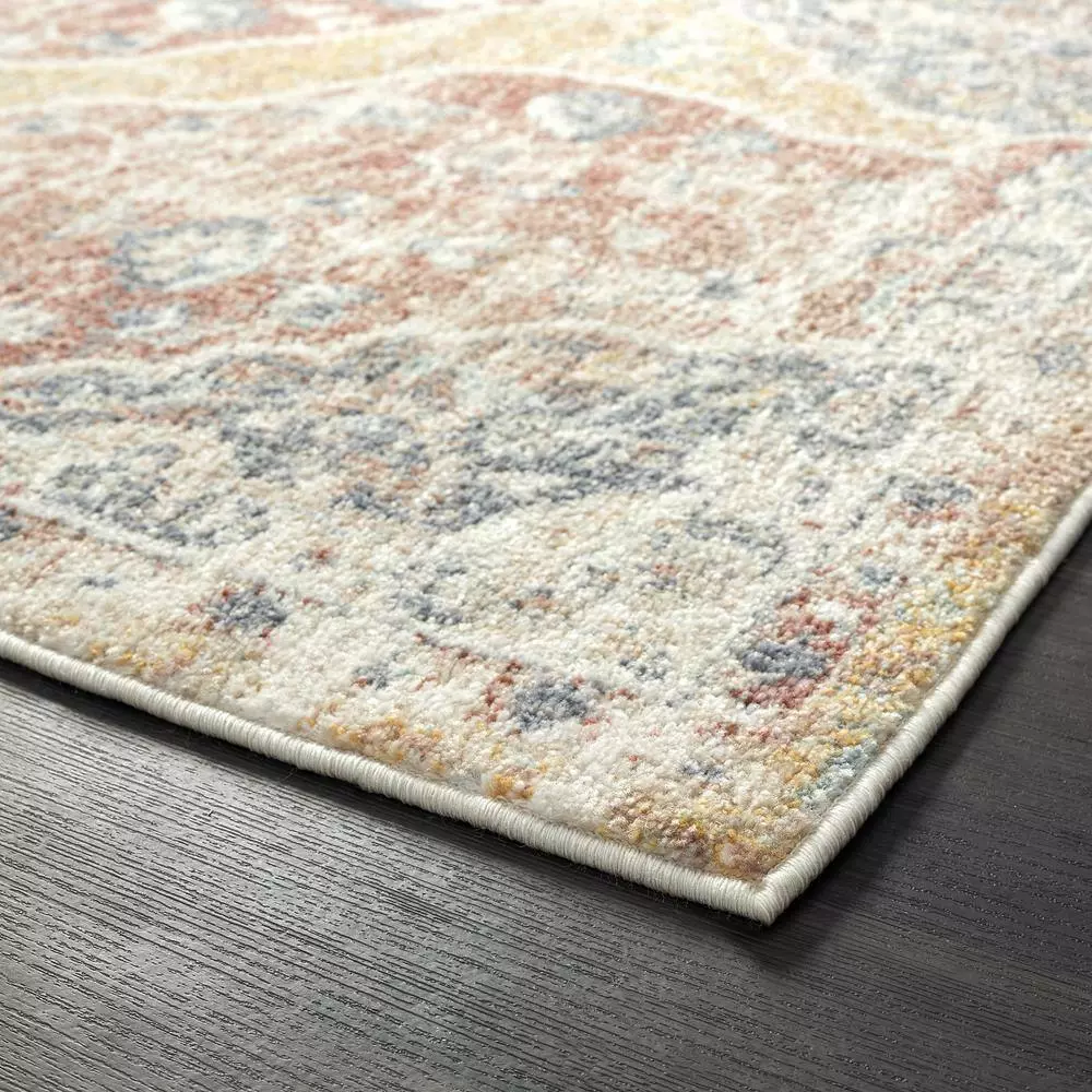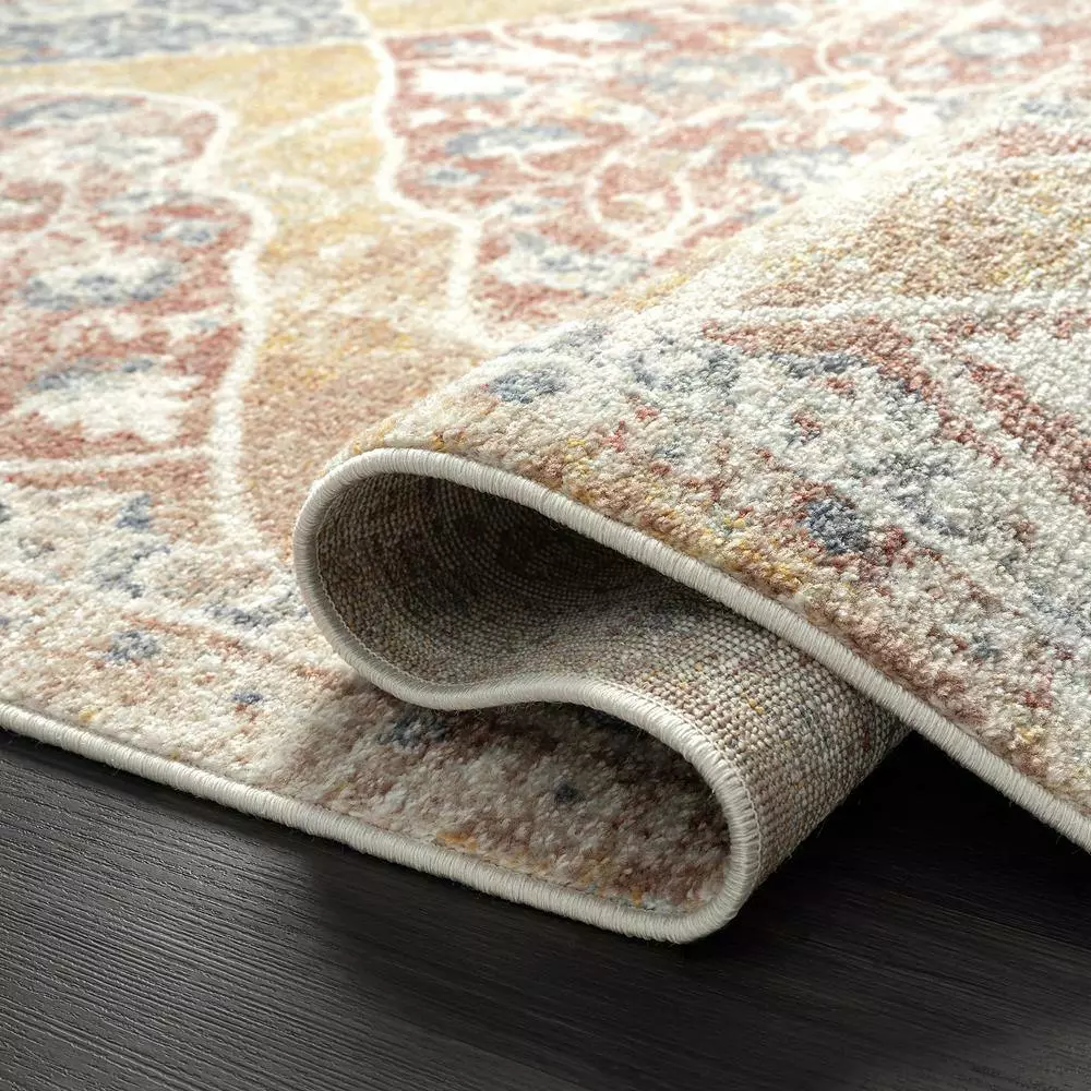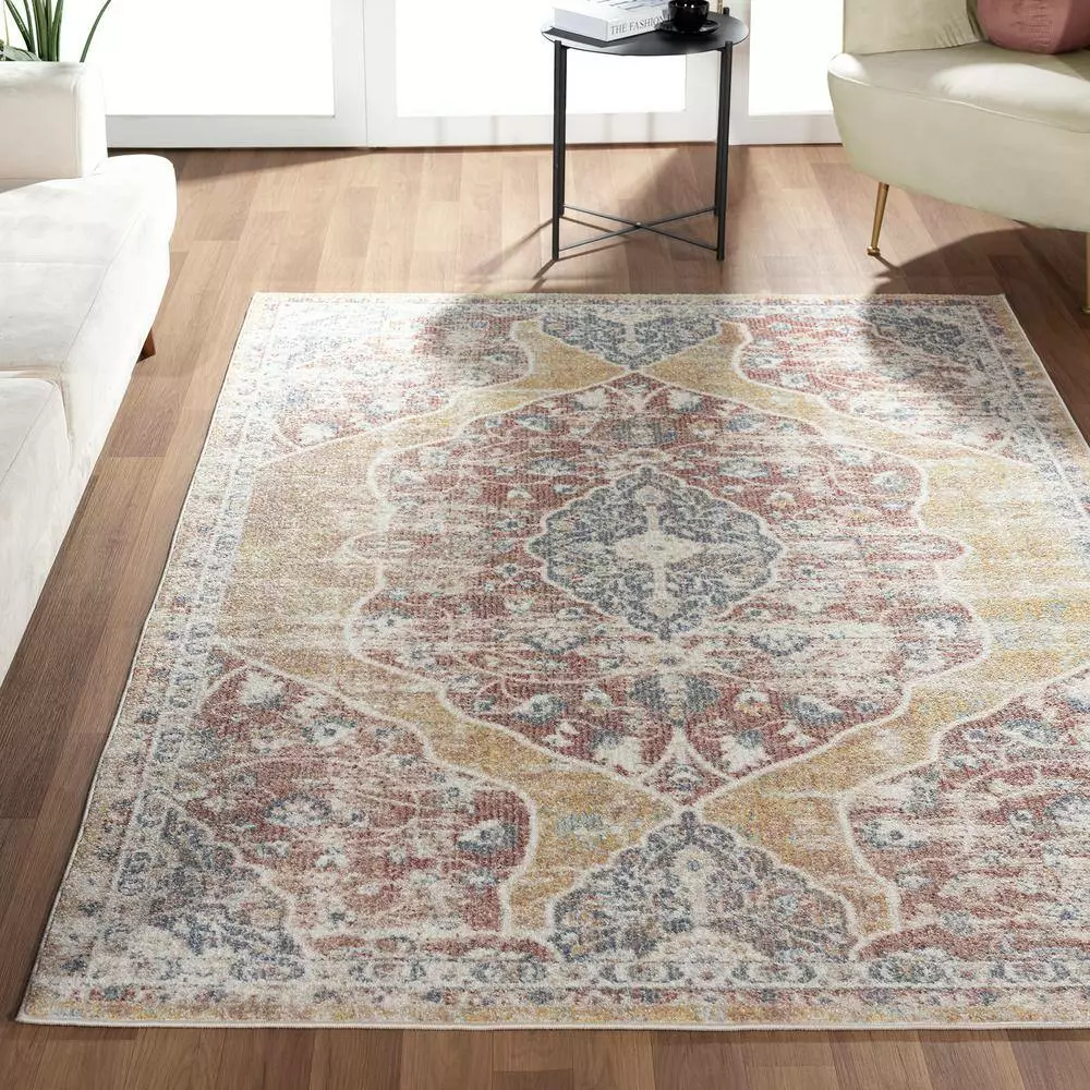 For a traditional favorite, choose this area rug for your space. Though simple, this rug proves that more remains to be discovered within the details. The beige background color and border might be simple, but it perfectly balances the splash of warm color placed throughout. The warm blue and burnt orange offer dimension within the floral and medallion design, but they won’t overpower your existing design aesthetic. Welcome warm, sophisticated charm into your home with this easy-care rug.