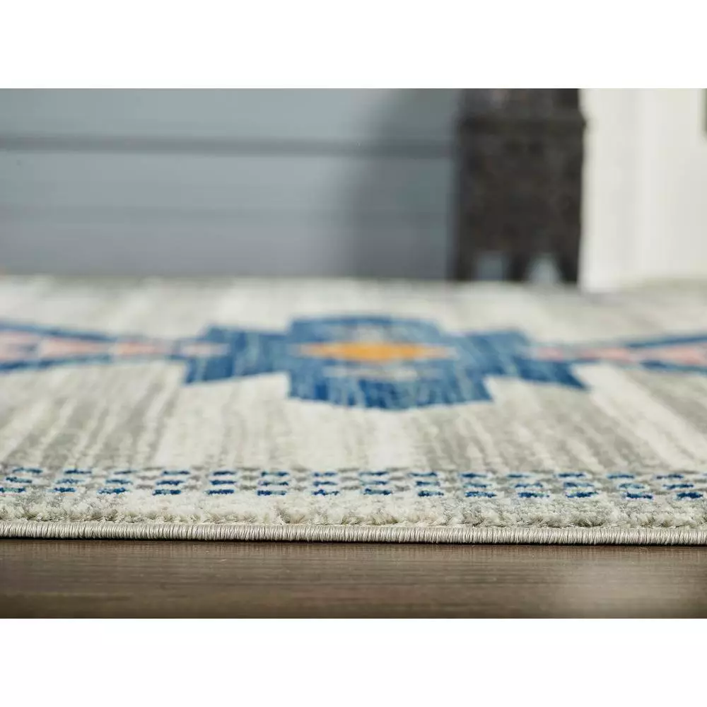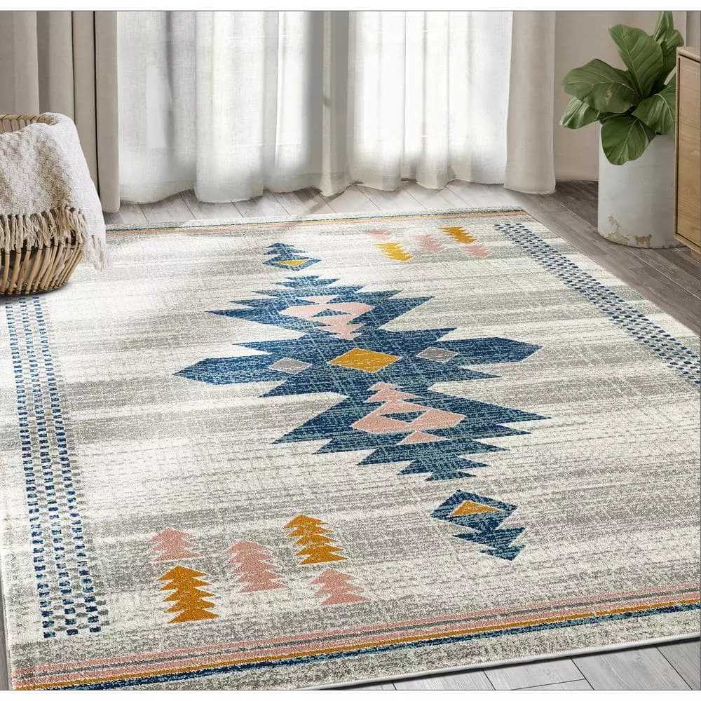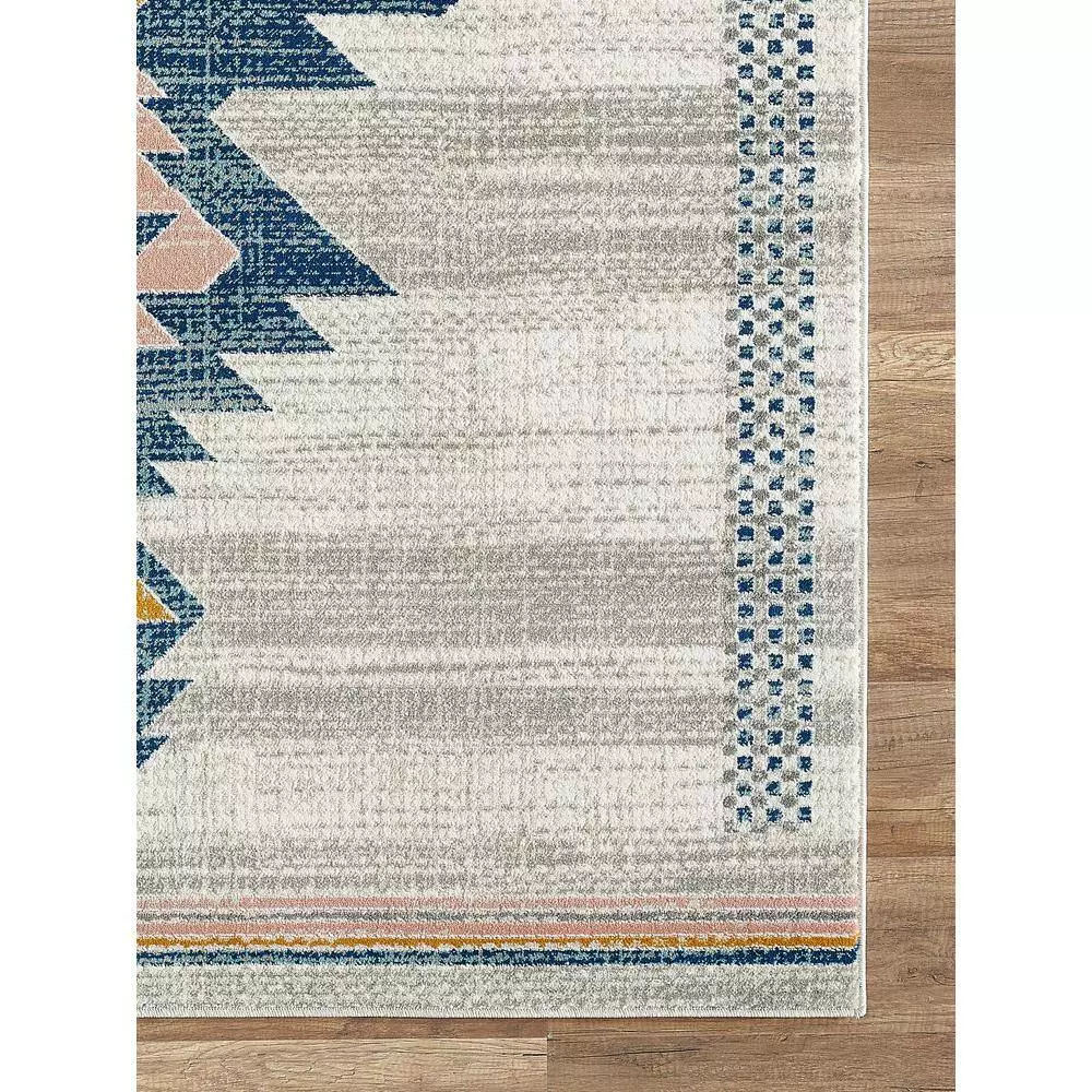 This striking Porto Southwestern style tribal print rug brings all of the adventure and beauty of the American southwest region into your home. The striking tribal pattern features geometric zig-zag edges in a vibrant royal blue, contrasting the coral and orange accents. The outer corners include bordered patterns and orange and red arrows, pointing towards your next adventure. Despite the bold design, the sand colored background helps match this area rug to any space in your home, whether it’s used in your living room or a home office. Make a statement with this easy-care, traditional design that will last for years to come.