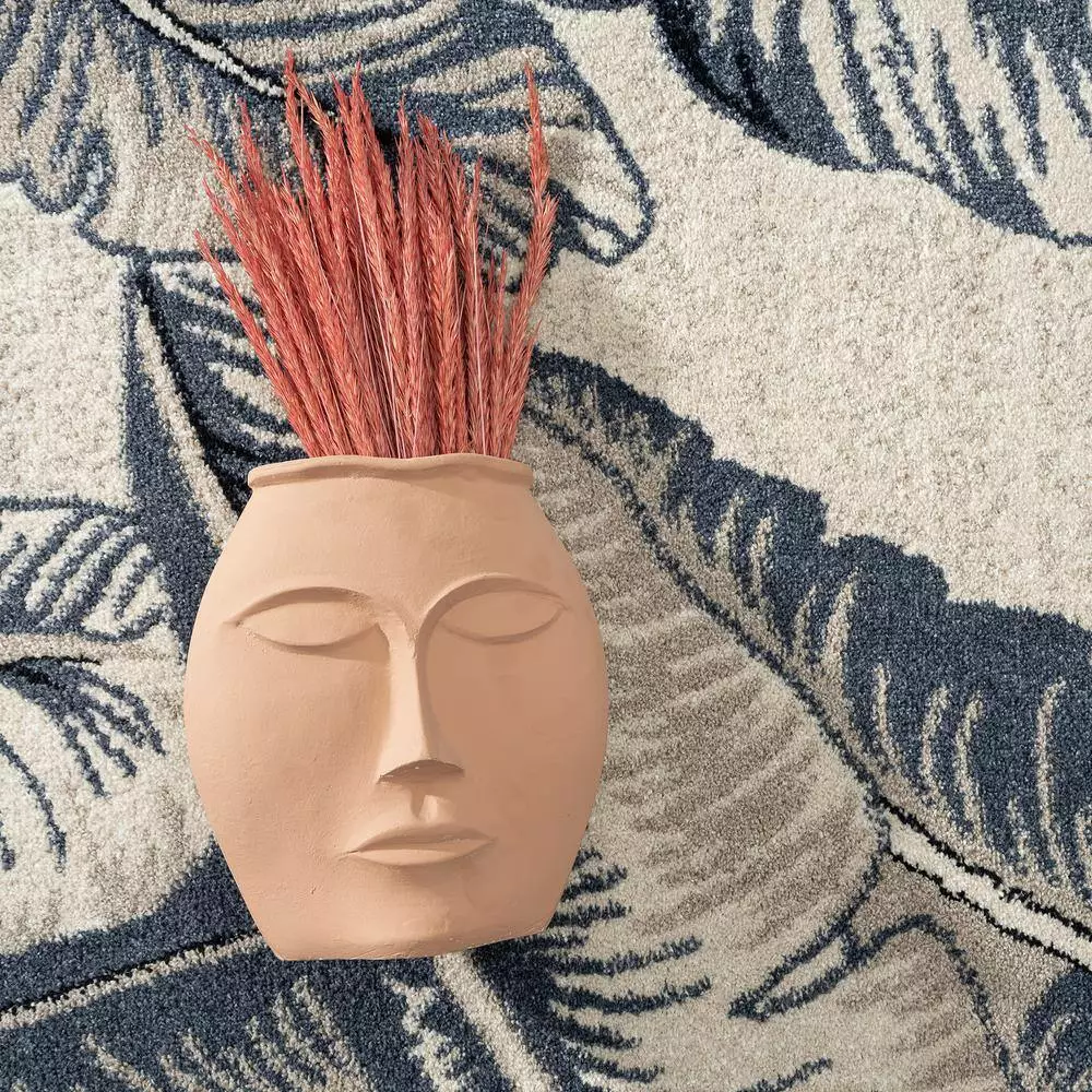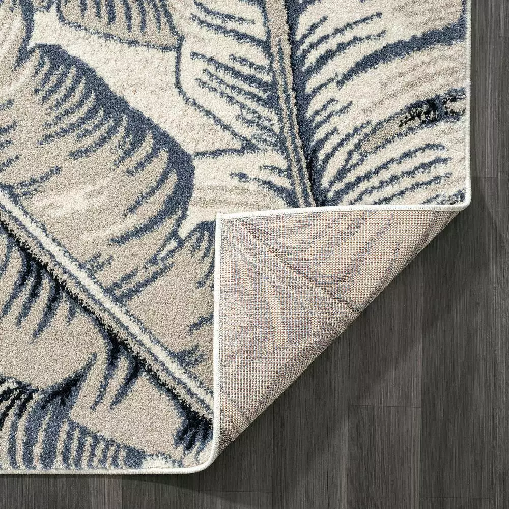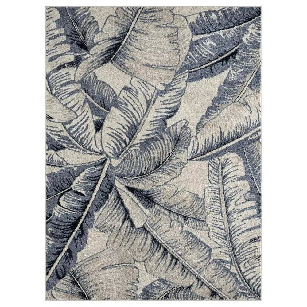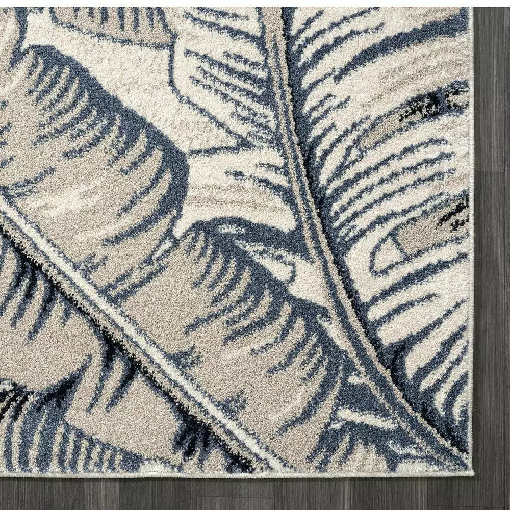 A monochromatic tropical rug with tones of blues, beiges, greiges. The popular banana leaf is portrayed on this rug design creating an elegant tropical design to suit contemporary and transitional room decors. The leaves are woven in a tasteful manner to create a chic rug helping bring the outdoors inside.