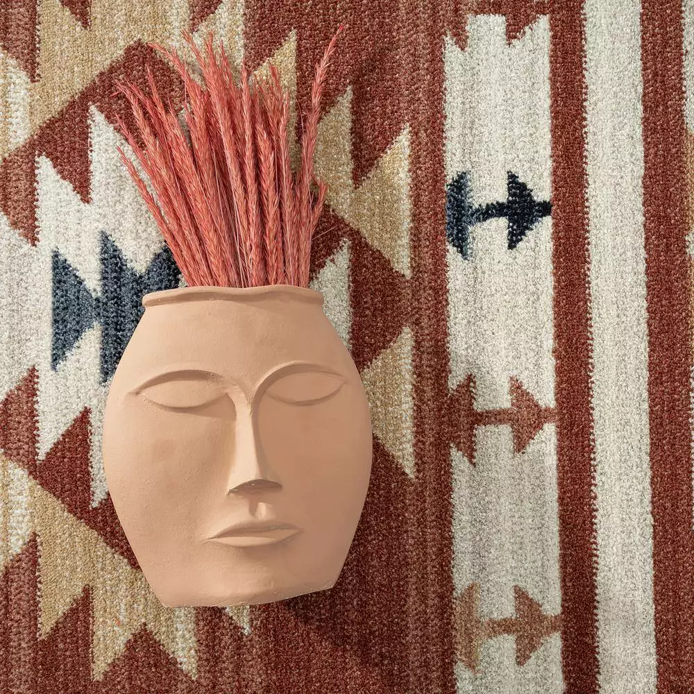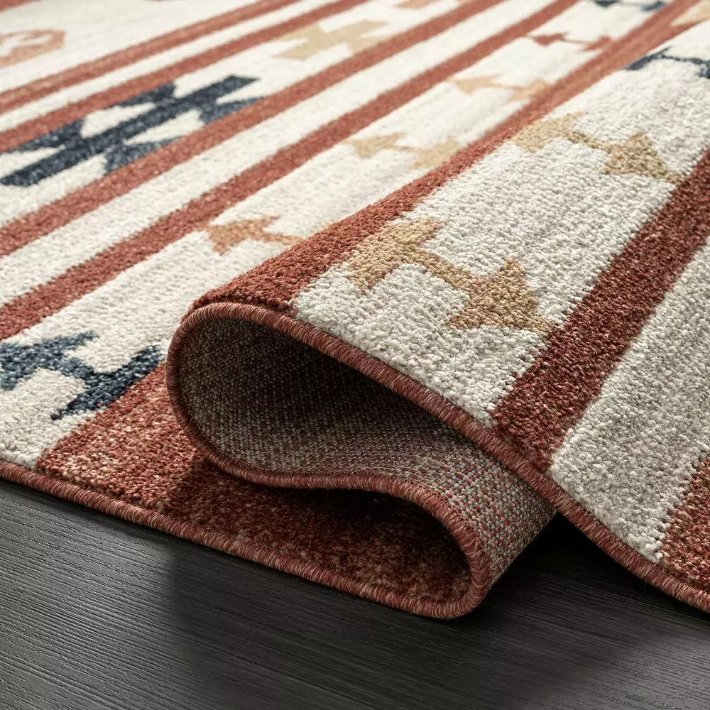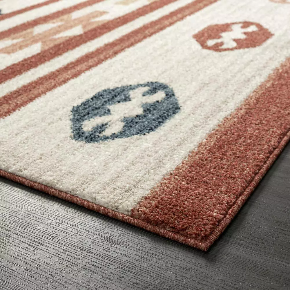 A classic tribal design inspired by Southwestern colors and geometric patterns. This Southwestern inspired area rug brings together earth’s rust colors with a blend of beiges and creams. Tribal geometric shapes in teal, yellow and orange adorn the rug. The versatile design of the rug offers the possibility of pairing it with either contemporary or southwestern room decor.